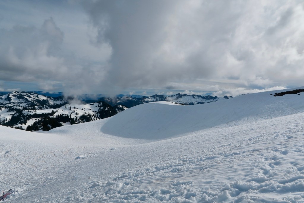 My pride and self confidence whither and die on the vine as we begin moving in 4 person rope teams up the glacier. Zach and Stephen point out crevasses hidden below thin layers of snow, letting experience tell them how one spot of snow apparently looks different than the others around it and is therefore dangerous. I try to see what they see and decide there’s a reason entire courses are devoted to avalanche safety and reading snowy terrain, I’ll just follow the rope and hope I don’t need to arrest a fall with this flimsy pole. Luckily, sort of, the snow is super soft and we are post-holing our way up this mountain. Every step sinks at minimum halfway up our shins, often going above knee height, requiring us to waste energy high-stepping to get free to the next sinking step. The walk up to the crater is labor intensive, but not particularly difficult from a technical perspective. The snow on the glacier is far easier to move over than the scree and talus from the approach to Liberty Bell. The biggest hurdle of the day is layering. Every break lets the wind whip through you and everyone pulls packs off to grab a layer. After ten minutes back moving we stop again to remove that layer. Somewhere around the 3 mile mark we reach the crater, the sulfuric smelling clouds drift across span and block our views, but looking back down the mountain the views of the Cascades are amazing. Mt. Baker is lower in elevation than Mt. San Jacinto in southern California, but looking down at the tops of dozens of snowy peaks makes it seem so much higher than the views into the dusty valley of the Inland Empire.