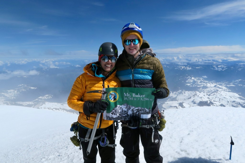 After eating our last snack we begin the final push to the summit, going up the steep as shit Roman Wall. The months of box step ups are paying off as I can picture episodes of Seinfeld in my head, pushing out the white snow of the slope. After a few self directed switch backs we make it to the extremely flat (when compared to the idealized mountain top we imagine) final “football field” as it is usually described. It is an easy walk to the final little bump that is the peak of Mt. Baker. We drop our packs at the bottom of the hill and begin the last little ascent of the day, and as a group, reach the summit.